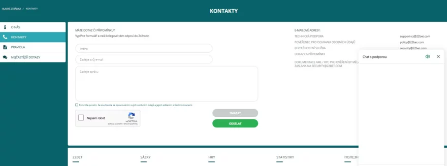 Nejrychlejším způsobem, jakým ve 22Bet můžete kontaktovat support, je live chat. Operátoři by měli být k dispozici 24/7. Příjemné překvapení je, že můžete komunikovat v češtině. Na druhé straně sice pravděpodobně vlastenec sedět nebude, ovšem podpora používá k odpovědi překladač. Pokud je zrovna operátor online, odpověď dostanete v řádu desítek vteřin.