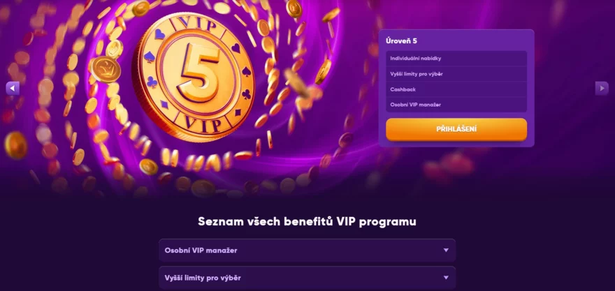 Pro věrné hráče je připraven exkluzivní VIP program s 5 úrovněmi. Každá úroveň přináší výhody jako vyšší limity pro výběry, cashback, nebo dokonce osobního manažera účtu. Čím vyšší status, tím více benefitů.
