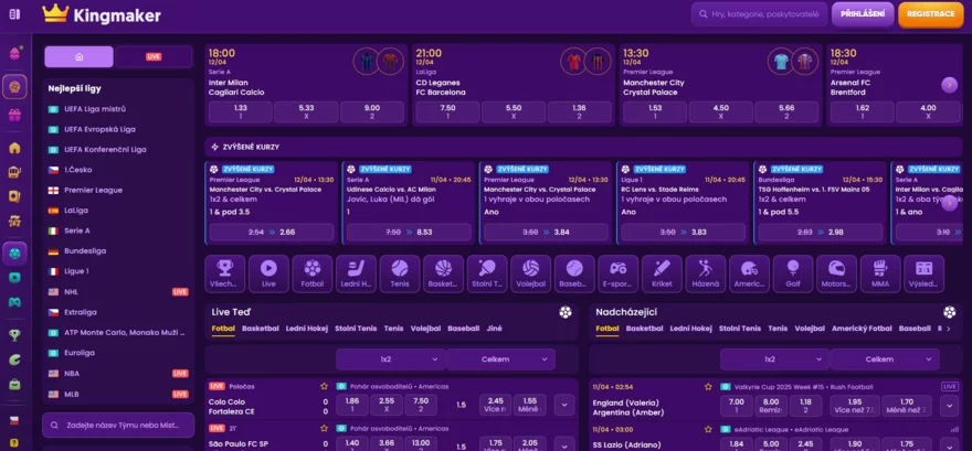 Sázková kancelář Kingmaker představuje spolehlivou volbu pro sázkaře, kteří ocení široký výběr sportovních událostí a atraktivní bonusové nabídky. Platforma disponuje bohatou paletou sázkových možností včetně živých sázek a live streamů, doplněnou o příjemný uvítací bonus, věrnostní VIP program a další skvělé bonusy.
