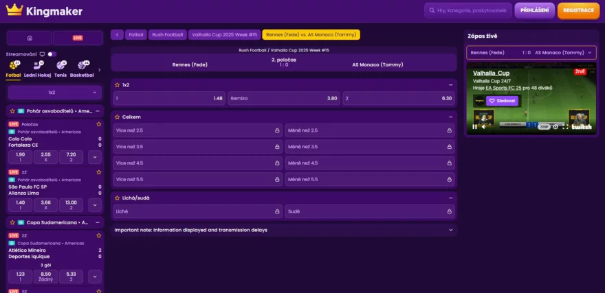 Live sázení je jednou z nejpopulárnějších funkcí moderních sázkových kanceláří, a Kingmaker v tomto ohledu nabízí ideální nabídku. Platforma poskytuje live sázky na vybrané sporty včetně fotbalu, tenisu, stolního tenisu a basketbalu. Kingmaker zajišťuje rychlé aktualizace kurzů a přehledné zobrazení dostupných trhů pro in-play sázení. Live sekce také nabízí streamy na vybrané disciplíny a turnaje. Esportová utkání můžete standarně sledovat přímo na platformě prostřednictvím live streamů z Twitche.