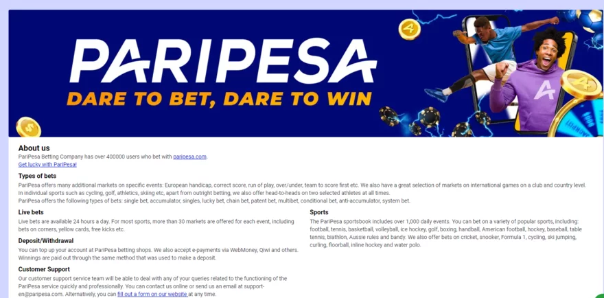 Sázková kancelář Paripesa je celkem mladou společností, která byla založena v roce 2019. Od svého vzniku si získala rychle rostoucí popularitu zejména mezi hráči ze zemí východní Evropy a Asie. Nabízí širokou škálu sportovních sázek, kasino her a dalších zábavních možností. Sázkaře bude zajímat především široká nabídka sportovních trhů,včetněfotbalu, tenisu, basketbalu, hokeje, esportů a dalších méně populárních sportů. Velká nabídka je i v počtu sázkových příležitostí, nechybí ani možnost live sázek.