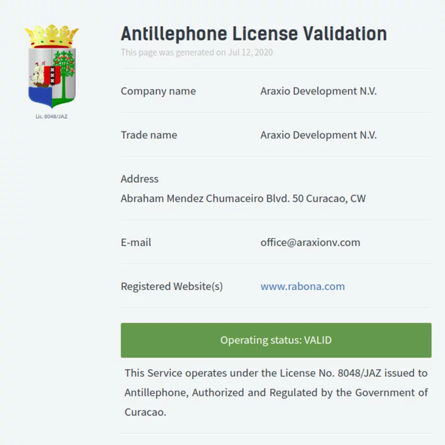 I když Rabona nemá licenci ve všech evropských zemích, českým a slovenským sázkařům se dostává přívětivého přístupu. Licence č. 8048 / JAZ, kterou vydala společnost Antillephone, je regulována vládou Curacao. Takže si můžete být jisti, že Rabona poskytuje bezpečné prostředí pro vaše sázky.
