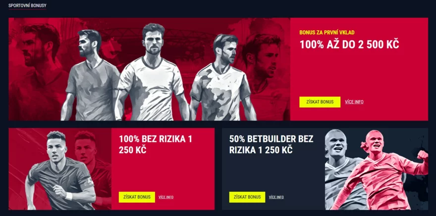 Noví hráči si mohou při prvním vkladu nárokovat 100% bonus až do výše 2 500 Kč. Tento bonus je určen pro sportovní sázení a aktivuje se při minimálním vkladu 500 Kč.