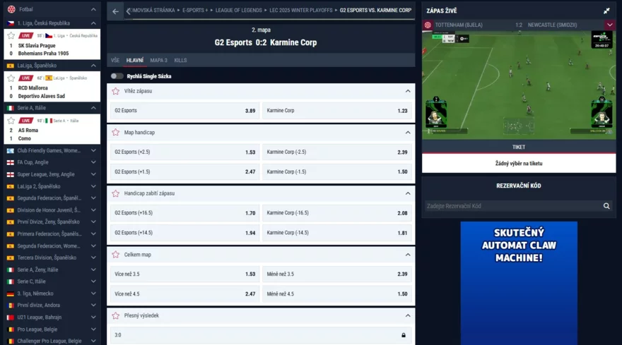 Pojďme k tomu nejdůležitějšímu – ke kurzové nabídce. Ta je graficky velmi vyvedená, což výrazně pomáhá ke snadné orientaci. Každý sázkař jistě ocení i funkci lupy, která pomůže urychlit hledání. Live sázení má dokonce svou vlastní sekci.