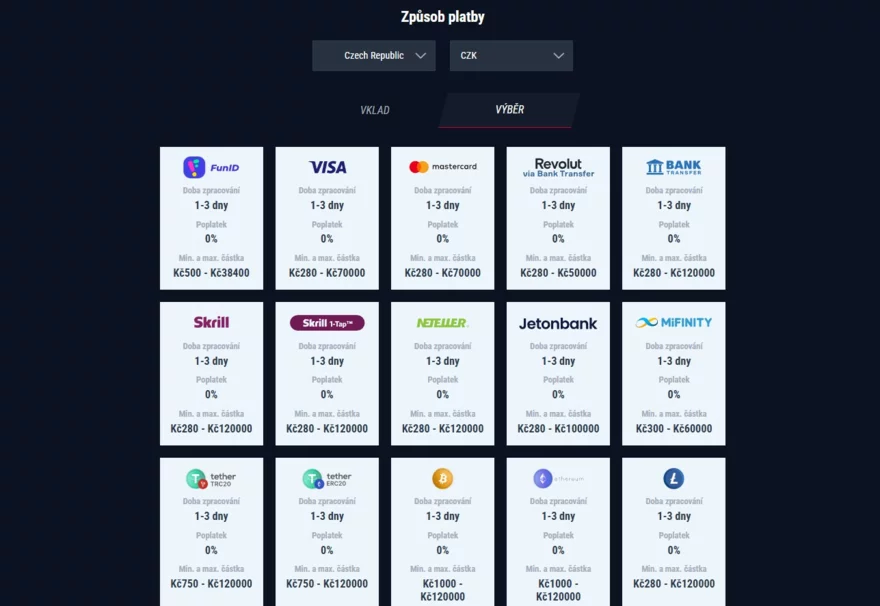 Vklady jsou okamžité u většiny metod, což umožňuje začít sázet bez zbytečného čekání. Výběry jsou také rychlé, zejména u e-peněženek a kryptoměn, kde transakce bývají zpracovány obvykle do 24 hodin. Bankovní převody mohou trvat déle, ale i zde je proces obvykle dokončen do tří pracovních dnů. Minimální vklad i výběr je většinou kolem 280 Kč. Platforma neúčtuje žádné poplatky za transakce. Není zde co vytknout.