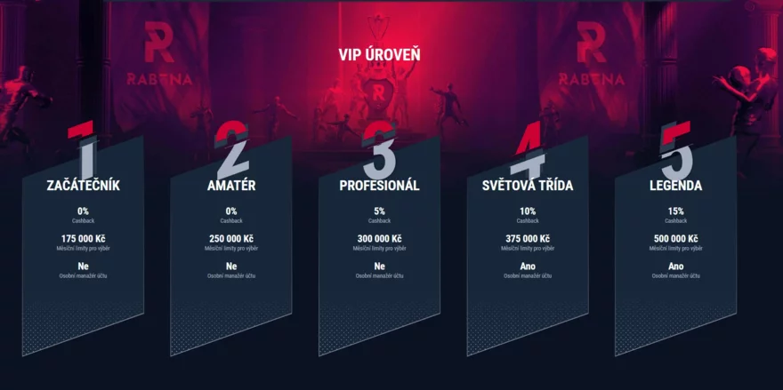 💎 VIP program je rozdělen do pěti úrovní, které mají specifické výhody. Například na úrovni „Začátečník“ máte limit pro výběr až 175 000 Kč, zatímco na úrovni „Legenda“ se tento limit zvyšuje na 500 000 Kč a získáte 15% cashback. K tomu navíc dostanete osobního manažera, který se o vás postará.
