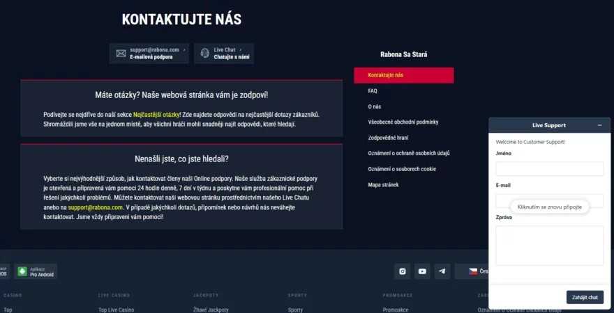 Nejrychlejší způsob, jak kontaktovat zákaznickou podporu Rabony, je přes live chat 💬.Chatbot a případně i operátoři jsou k dispozici 24/7. Určitě vás příjemně překvapí rychlost odpovědí. Pokud je operátor online, odpoví vám během několika desítek vteřin. S podporou u Rabony můžete komunikovat nejen anglicky, ale také německy, italsky, polsky, finsky, norsky, maďarsky a rusky. Live support je navíc lokalizovaný i do češtiny.