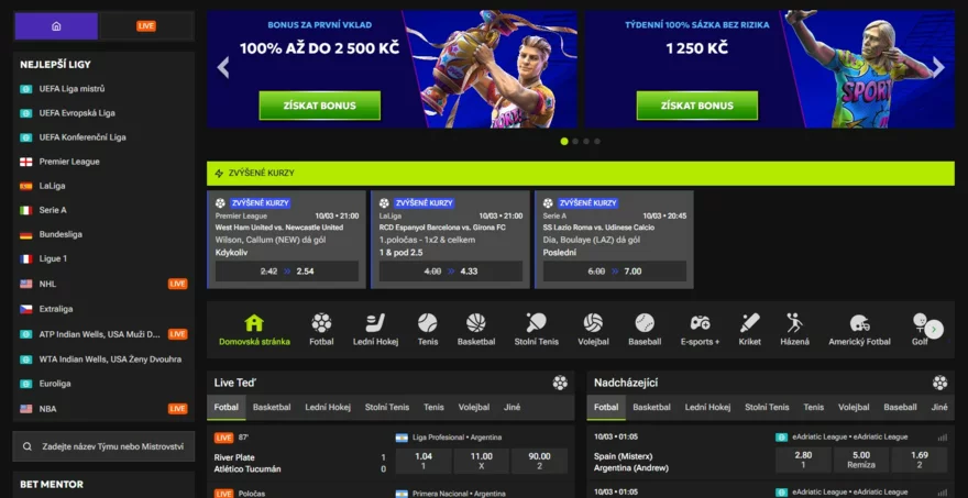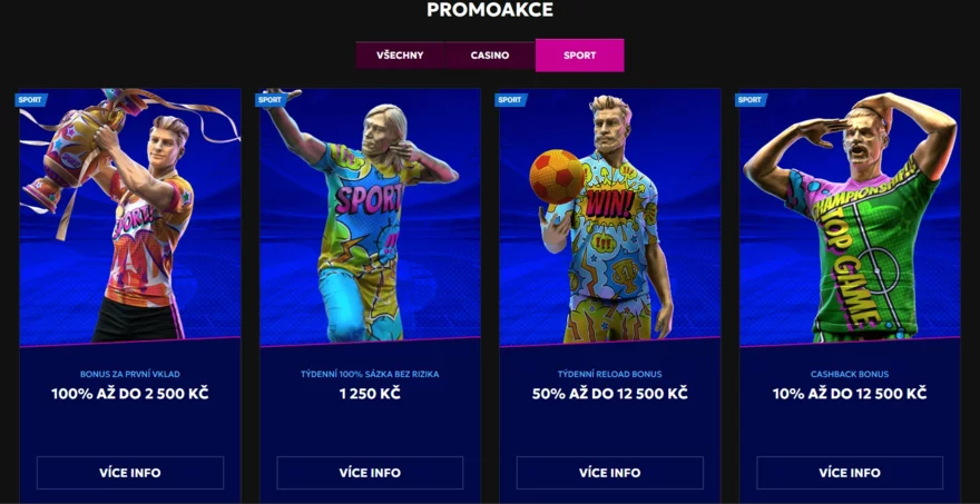 Dalším lákadlem jsou atraktivní bonusy a promoakce. Uvítací bonus nabízí 100 % k prvnímu vkladu až do 2 500 Kč, což je skvělý start pro nové hráče. Pravidelné akce, jako jsou cashbacky, reload bonusy nebo free bets, zajišťují, že i stávající hráči mají stále důvod se vracet.