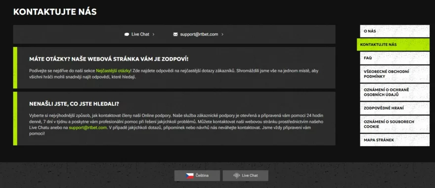 Zákaznická podpora RTBet je dostupná 24/7 prostřednictvím dvou hlavních kanálů – live chatu a e-mailu. Live chat je nejrychlejší možností, jak kontaktovat profesionální customer support v případě potřeby. Podpora je profesionální a ochotná, s možností komunikace v češtině. Pro složitější dotazy je k dispozici e-mailová podpora na adrese support@rtbet.com, avšak odpovědi v tomto případě mohou trvat o něco déle.