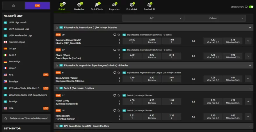 Live sázení je na platformě intuitivní a nabízí rychlé aktualizace, podrobné statistiky a přehledné rozhraní.